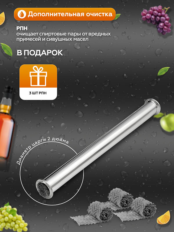 Внутри царги можно расположить до пяти регулярных проволочных насадок Панченкова (3 штуки идут в комплекте), которые способствуют дополнительной очистке дистиллята.